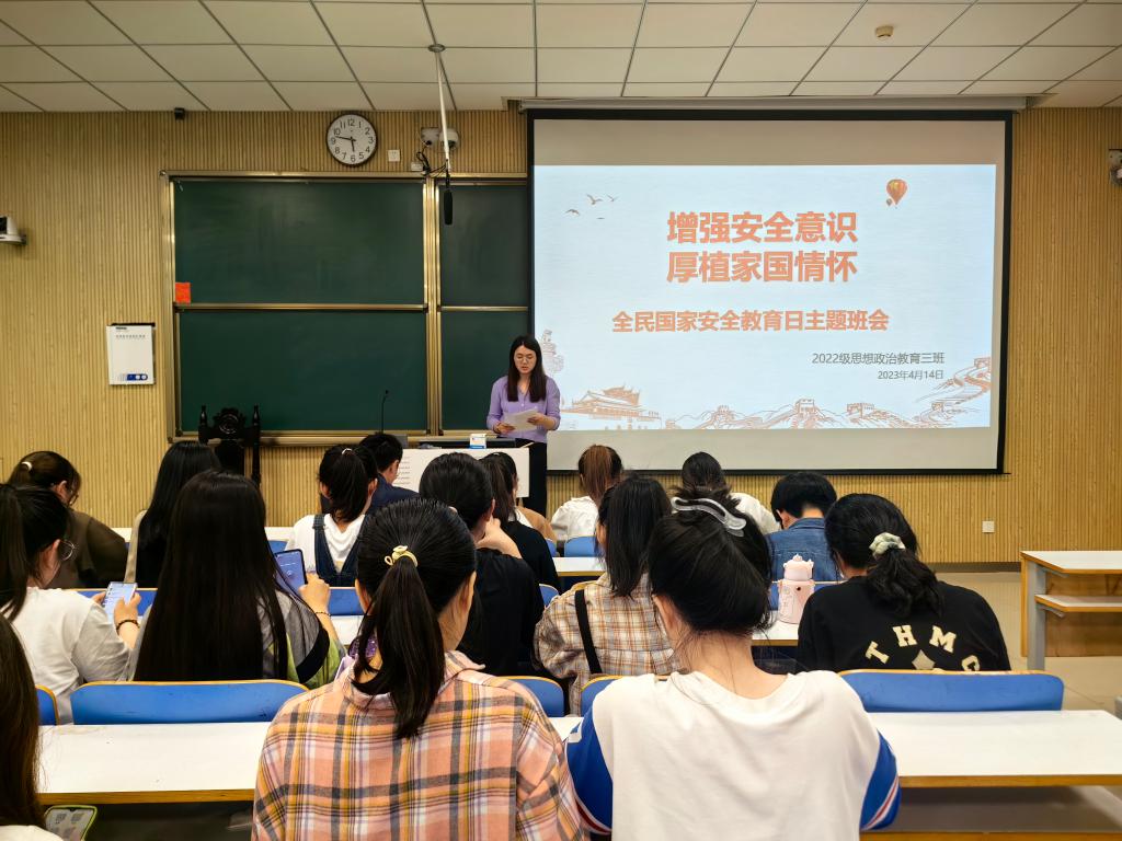 思想政治教育专业全部班集体相继召开主题班会,围绕“什么是国家安全”、“为什么重视国家安全”和“如何维护国家安全”三方面展开。采取辅导员讲解、PPT放映、播放视频和电影相结合的形式,帮助同学们了解国家安全,引导青年树牢总体国家安全观。