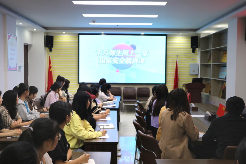 党委副书记黄煌、专职组织员任婷、专职辅导员沈海蓄、2022级辅导员以及部分学生代表在社科楼323会议室共同观看直播。课堂上,讲解员从国家安全的内涵出发,深入浅出地阐述国家安全的重要意义,以生动、鲜活的案例向高校师生展现维护国家安全的正确行为示范,教育引导广大师生树牢总体国家安全观,将国家安全意识转化为自觉行动,生动实践“国家安全,有你有我”。