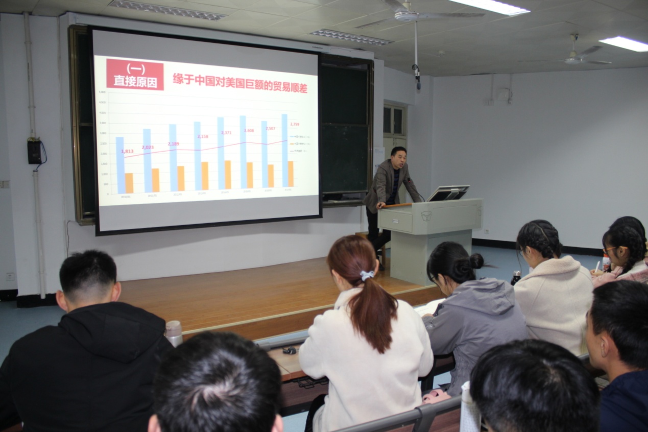 2019年研究生学术活动月“读原著学原文悟原理”系列校内讲座第三场在人文楼408教室举行,由王帆宇博士做《新时代中国外交面临的机遇、挑战与对策——以中美贸易摩擦为例》专题讲座。学院全体研究生参加了讲座。
