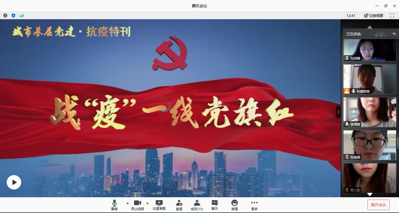 研究生党支部组织开展《战“疫”一线党旗红》线上观影学习交流活动,支部全体党员参与会议,会议由支部副书记李频捷主持。