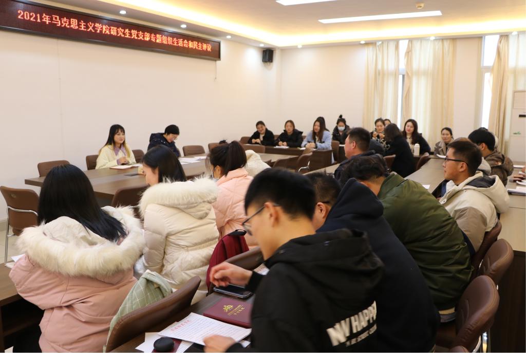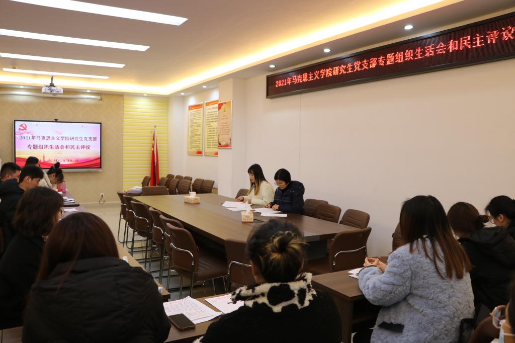 研究生党支部在社科楼323会议室召开2021年度专题组织生活会和民主评议会,会议由支部书记郑晨霞主持。