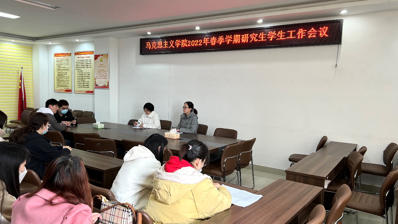 在社科楼323会议室召开2022年春季学期研究生学生工作会议,全体在校研究生、研究生秘书卢云晓和班主任郑晨霞参加,会议由卢云晓老师主持。