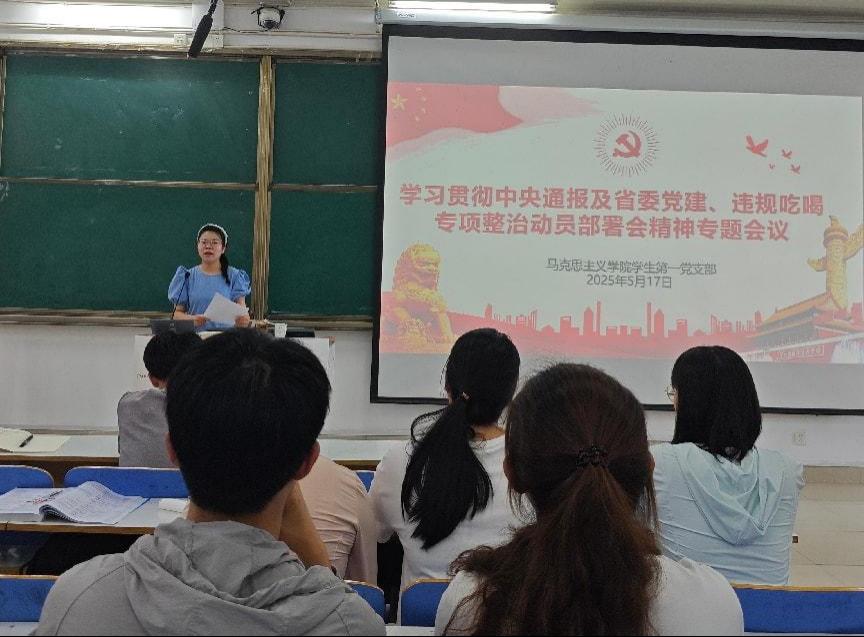 学生第一党支部召开了学习贯彻中央通报及省委党建、违规吃喝专项整治动员部署会精神的专题会议。会议由学生党支部书记高小佳主持,全体学生党员参会。