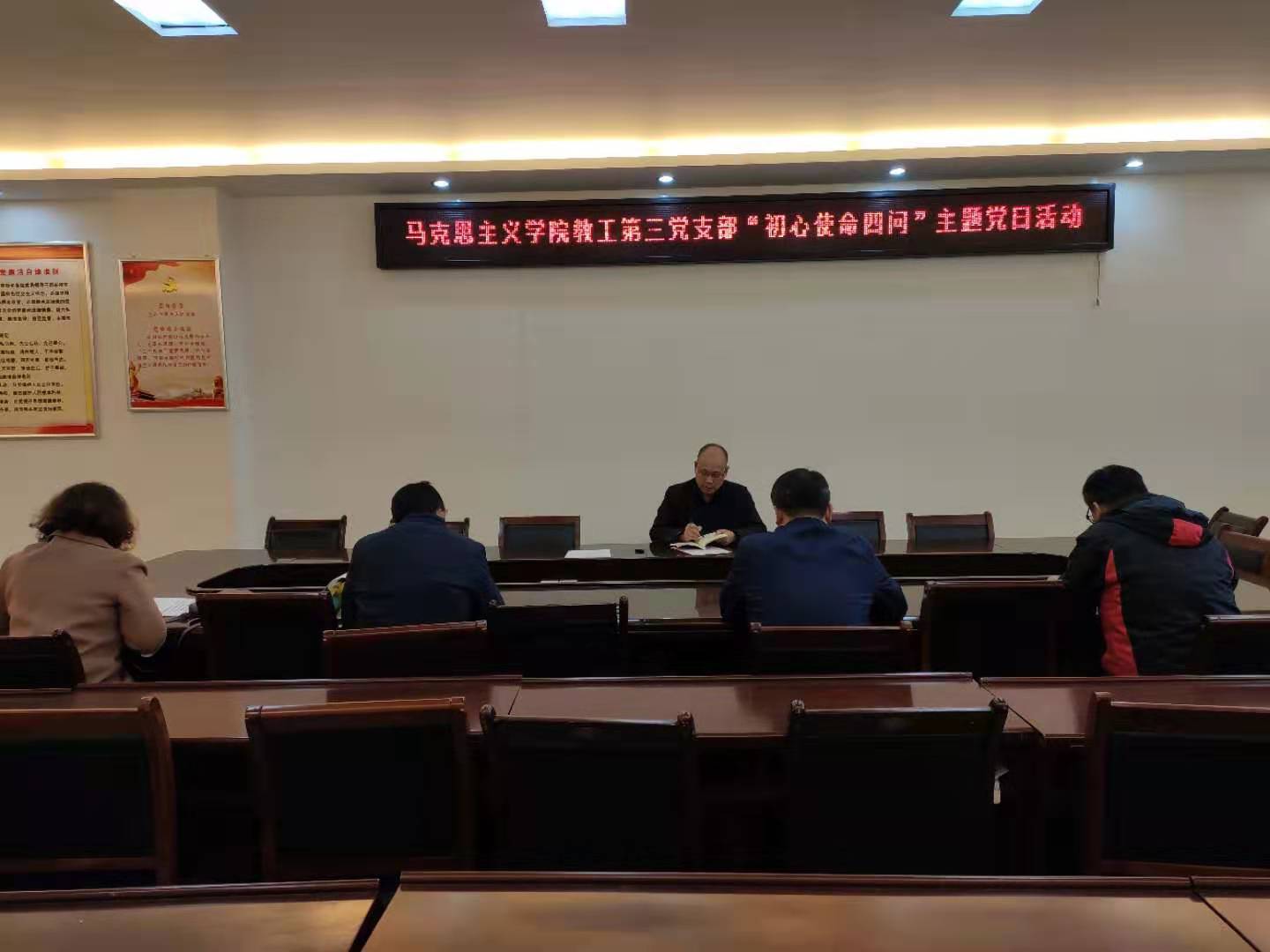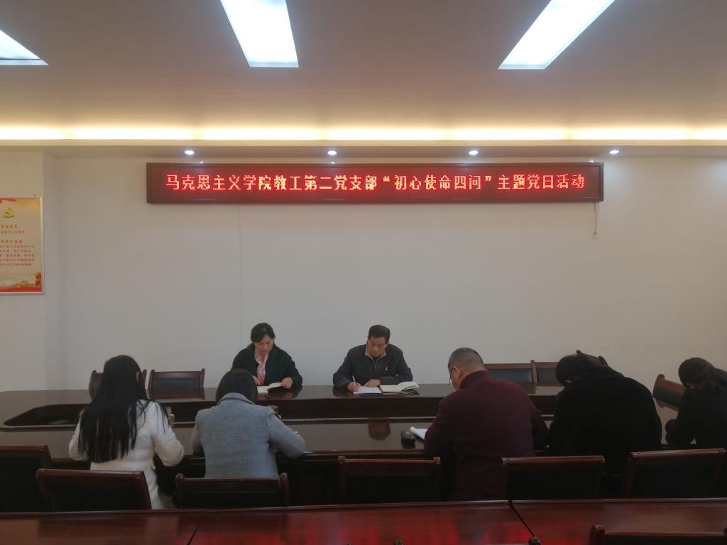 学院全体师生党员在深刻对照“入党初心是什么、党员使命担什么、对照先进差什么、立足本职做什么”,认真填写了《党员初心使命四问表》的基础上。11月19日,教工四个党支部分别在社科楼323、社科楼504(哲学教研室)、三个学生党支部分别在社科楼516教室和教五203开展了“初心使命四问”主题党日活动,全体党员分别立足个人理想信念、宗旨观念、党员意识、担当作为、示范引领、教学科研等方面问题,结合“初心使命四问”内容,开展“学、查、改、做”,推进“不忘初心、牢记使命”主题教育活动引向深入。