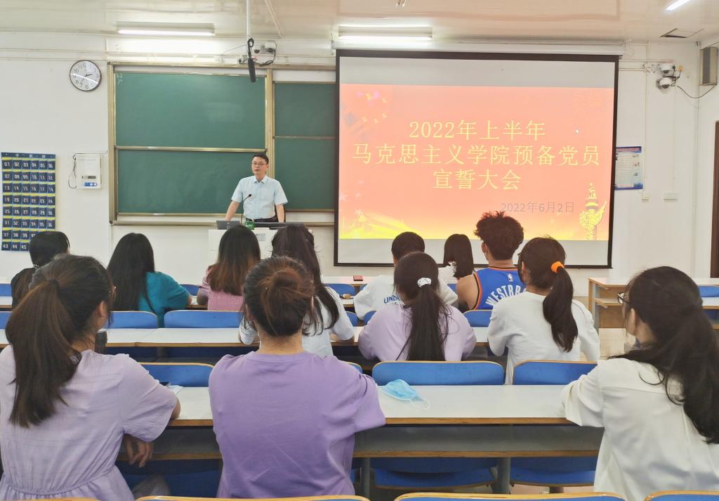 宣誓仪式在气势磅礴的国际歌中正式开始。在老师的领誓下,学院的预备党员右手握拳,面向党旗,齐声念出入党誓词,气氛热烈,振奋人心。短短80个字,是怀揣初心站在新起点的他们对党的庄严承诺,是担起使命迎接新挑战的他们为人民服务的强大决心。