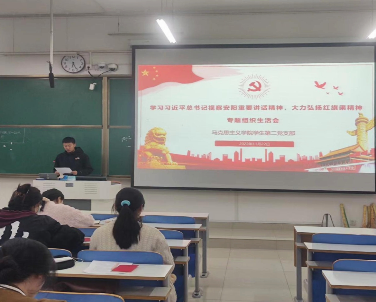 学生第二党支部在社科楼414教室以“深入学习习近平总书记视察安阳重要讲话精神,大力弘扬红旗渠精神”为主题,围绕“习近平总书记视察安阳重要讲话精神”召开专题组织生活会。会议由于嘉宁同志主持。