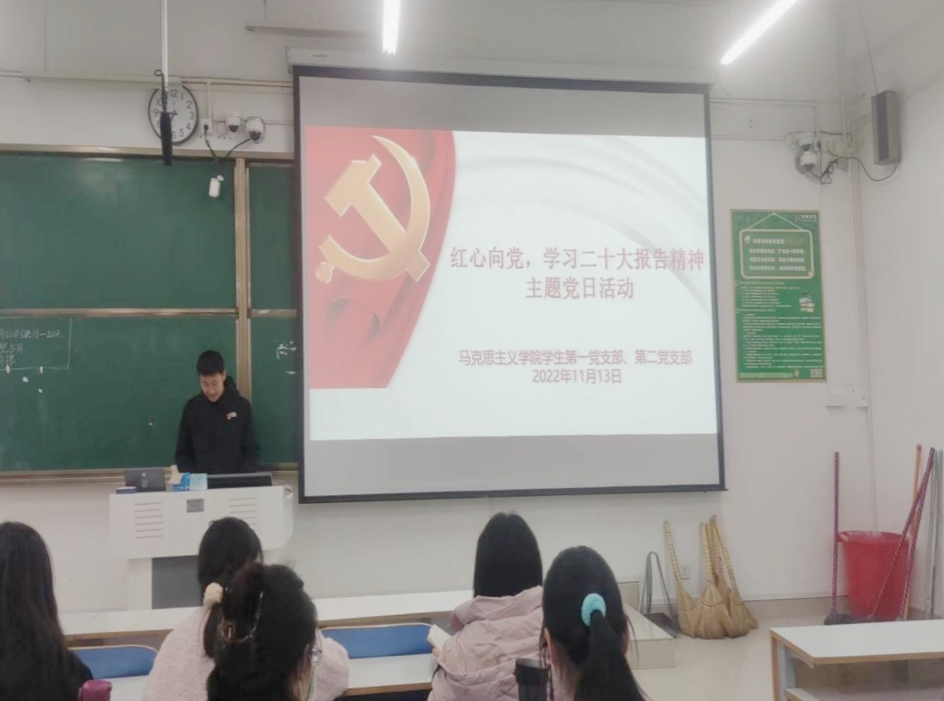 学生第一党支部、第二党支部在社科楼414教室开展“红心向党·学习二十大报告精神”主题党日活动。学生第二党支部全体党员参加此次活动。会议由于嘉宁同志主持。