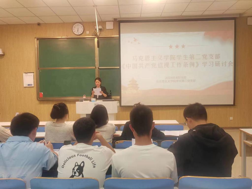 会议伊始,学生第二党支部书记任婷带领全体同志学习《中国共产党巡视工作条例》,对《条例》第三章第十八条进行深入学习,强调巡视工作应当紧盯权力和责任加强政治监督,严明政治纪律和政治规矩,进一步指出,巡视工作作为党内监督的重要组成部分,对于加强党的建设、维护党的纪律、推进全面从严治党具有重大意义,并鼓励全体同志深入学习《条例》精神。接着,刘珂含同志和冯雅静同志对自身学习巡视工作条例的心得体会进行发言。最后,任婷同志对本次学习研讨会作总结,强调各党员同志要加强对巡视条例的学习,扩充理论知识储备,将巡视工作作为加强自我监督、自我完善的重要途径,切实增强“四个意识”、坚定“四个自信”、做到“两个维护”。