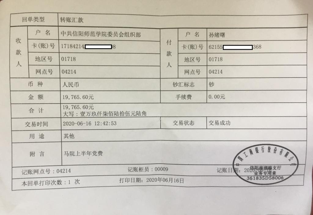 小说狂人 2020年1-6月学院师生党员缴纳党费转账单及收据
