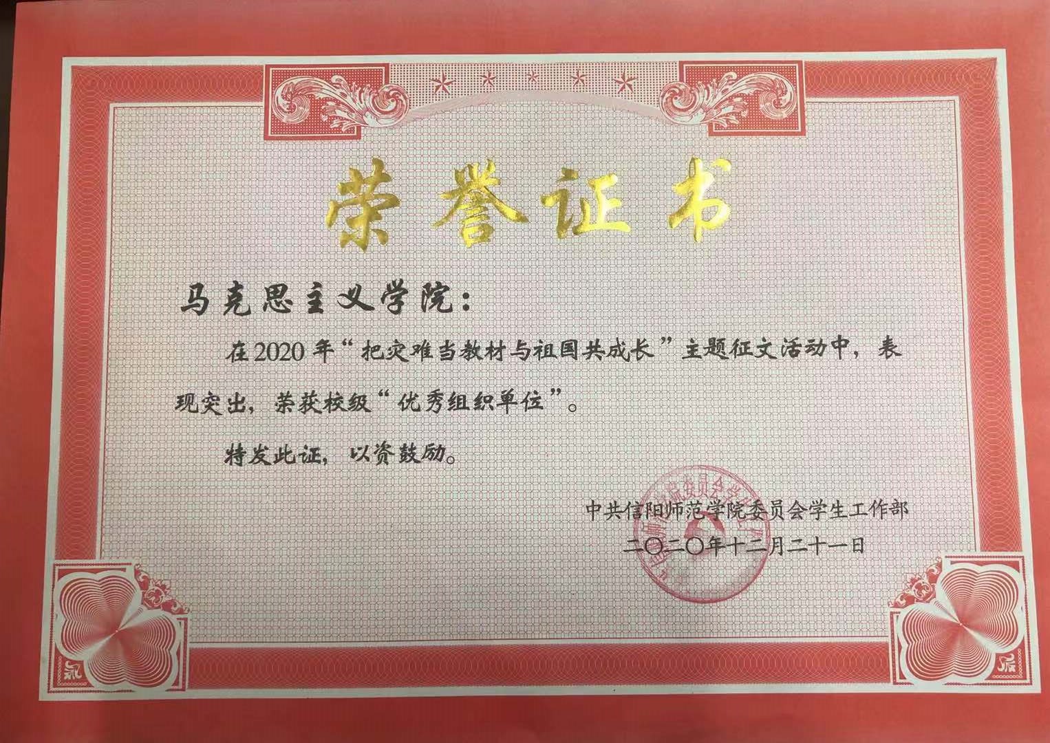 上下一心、共同努力,在创作“把疫情当教材与祖国共成长”主题征文活动中表现优异,荣获“优秀组织单位”称号。