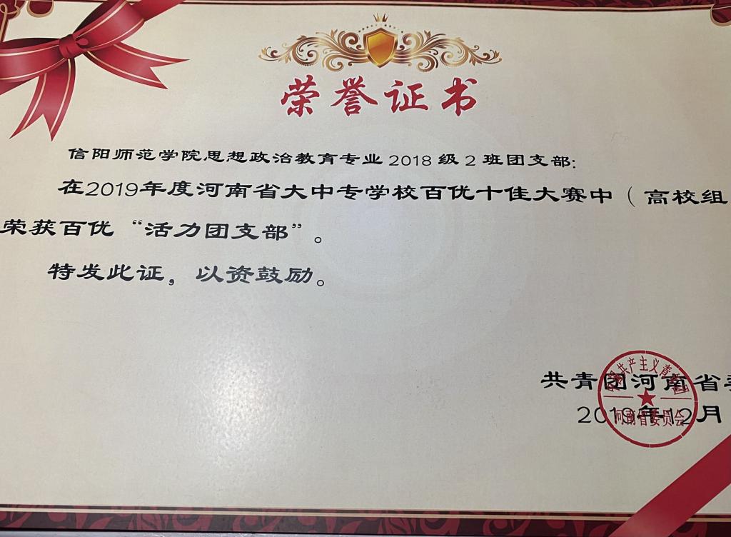 积极参与共青团河南省委组织的河南省大中专学校百优十佳“活力团支部”活动,2018级思想政治教育二班团支部表现突出,荣获“活力团支部”荣誉称号。