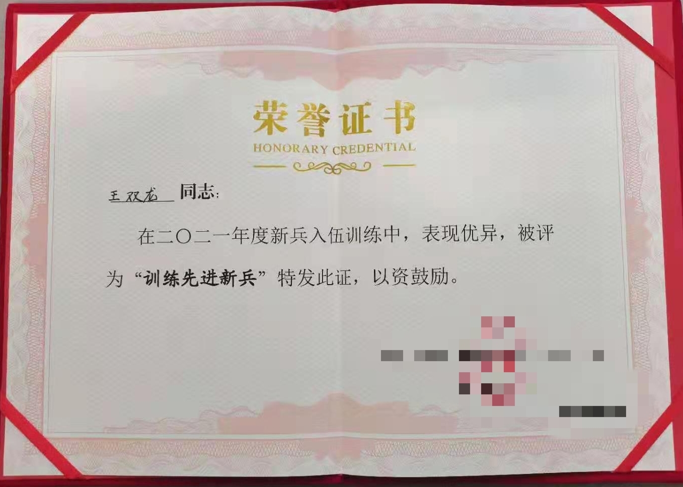 2020级思想政治教育专业一班学生,2021年应征入伍,目前服役于陆军某部队。入伍以后,王双龙在训练场上勇往直前,淬炼成钢,各方面表现积极,对于工作和任务认真负责,用实际行动唱响自己的军营梦。通过不断努力,王双龙凭借优异表现荣获2021年度“训练先进新兵”称号,受到陆军某部队领导一致好评。