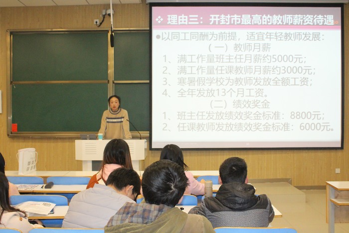 招聘会上,张影首先通过VCR的形式进行宣讲,视频以在校老师、在校学生、图书管理工作者、现任校长的角度让在座的大学生对求实中学有了初步的了解。接着,她结合ppt向在场学生详细介绍了该校的发展历程、教学环境、教师薪资及其他待遇等内容。她指出求实中学拥有最优生源和完备的软硬条件设施,同时致力于为在校教师打造轻松愉悦的工作环境,为教师构建专业成长平台,帮助其提升专业技能,希望同学们踊跃参与招聘。最后,负责人与学生进行面对面交流,对在场同学们提出的多个问题进行了一一解答。不少同学表示会认真考虑,并积极准备参与到后期的招聘面试活动中。