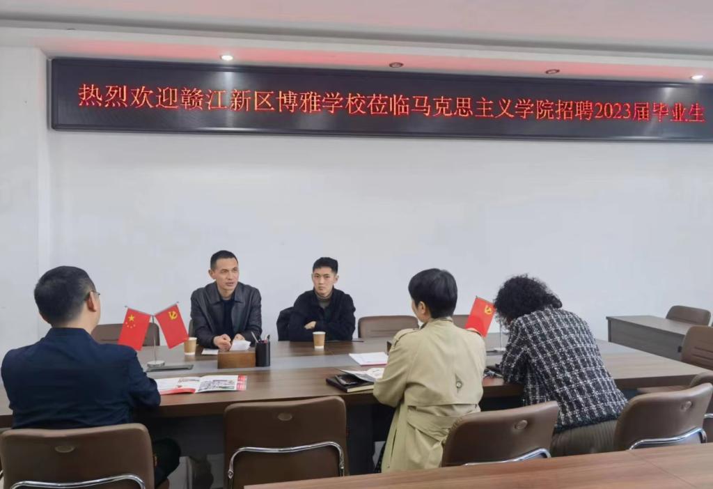 思政学子始终以马克思主义理论为指导,不断深化政治理论学习,致力于在学思践悟中成为有理想、敢担当、能吃苦、肯奋斗的新时代青年和“有理想信念、有道德情操、有扎实学识、有仁爱之心”的四有好老师。随后,共青城博雅学校高中部校长王东伟介绍该校概况、发展历程与招聘需求。他们始终坚持高品质、高标准、高要求办学,用心做事,爱心育人,以“培养具有中国灵魂、世界视野的未来人”为培养目标,坚持“人人有选修,人人有特长”的个性化课程体系,致力于打造“五合一”的新型学校。双方在融洽的气氛中热烈交流,招聘会议取得圆满成功。