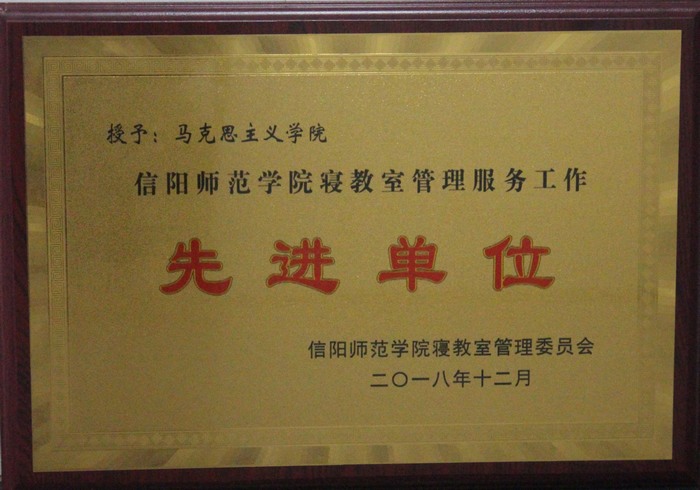 根据信阳师范学院学生劳卫工作评比及奖惩实施细则,经学院相关单位审定,小说狂人 在寝教室管理服务工作中积极参与、表现突出,荣获“信阳师范学院2017-2018学年寝教室管理服务工作先进单位”称号。