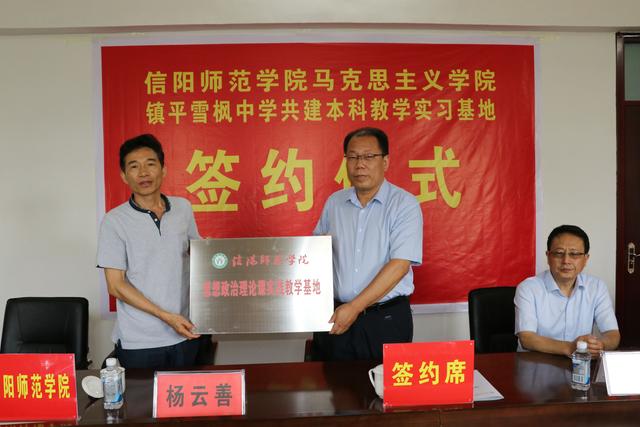 与镇平县雪枫中学举行共建本科教学实习基地签约仪式。该校校长张立富、校党政办主任蒋鼎出席会议。作为以无产阶级革命家、军事家彭雪枫将军名字命名的市级示范性普通高中,近年来,该校始终秉承将军遗志,坚持“育人为本,质量第一,精实管理,绿色发展”的办学理念,努力打造“新优质项目”,致力于培养身心健康、品德优良、学力扎实、志趣尚美的优秀中学生,为高校和国家建设输送合格的毕业生。