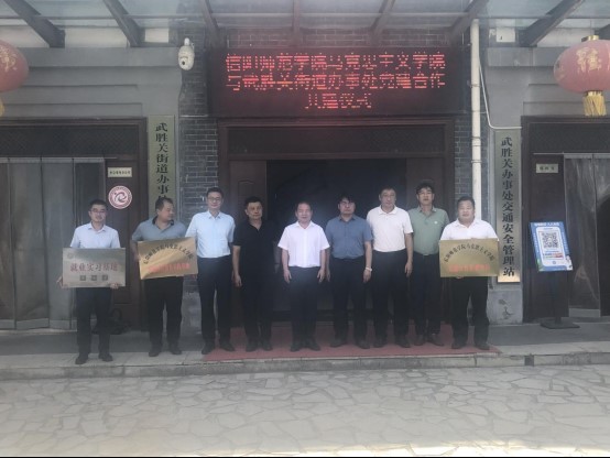 党建合作共建单位、思想政治教育实践基地、信阳师范学院“就业实习基地”牌匾。
