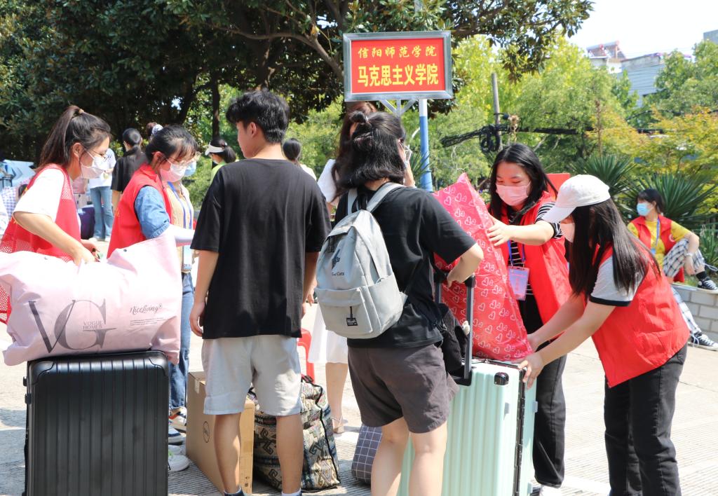 志愿者提前到达迎新点,等待新生的到来。迎新现场,学生会各部门协同联动、责任到人,安排志愿者引导新生完成身份核验与健康核查后进行有序报到,为新生提供了针对性的咨询和服务。志愿者协助新生搬运行李的同时为新生介绍小说狂人概况