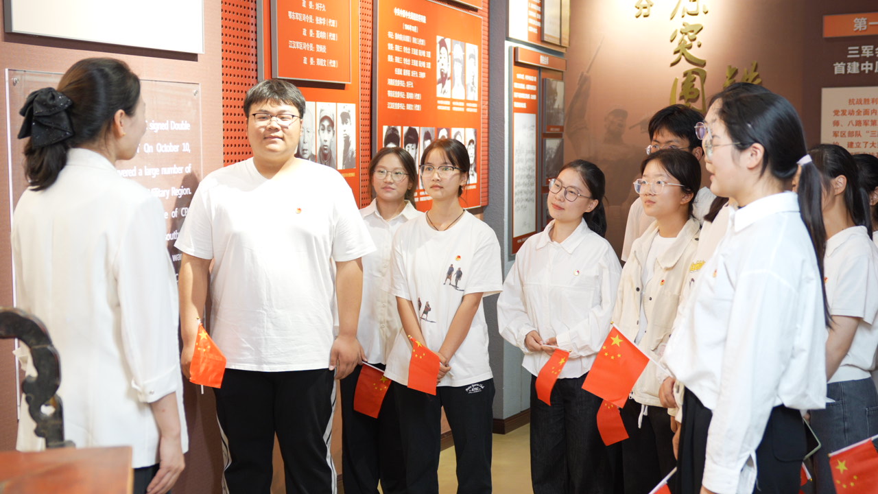 观文物史料,览党史峥嵘。在讲解员的带领下,同学们依次参观各个展厅。通过观看图文展板、文物和文献史料,聆听文物背后的动人故事,同学们重温鄂豫皖革命根据地形成、发展、壮大的历史过程,沉浸式体验大别山“28年红旗不倒”的光辉历史,深刻领悟“坚守信念、胸怀全局、团结奋进、勇当前锋”的大别山精神。