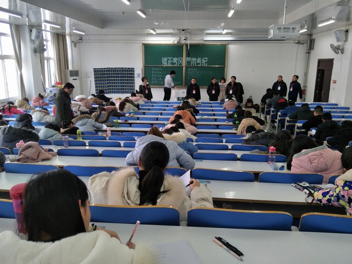 历来重视期末考务工作,教风与考风优良。2日下午,院长杨云善、党委书记唐国战、教学副院长程晋富等学院期末考务领导小组成员来到社科楼514、516考场巡视考务,认真查看考场环境,检查考生证件,了解考生答题情况,并对考场布置、考试纪律以及监考工作等均进行了细致检查。