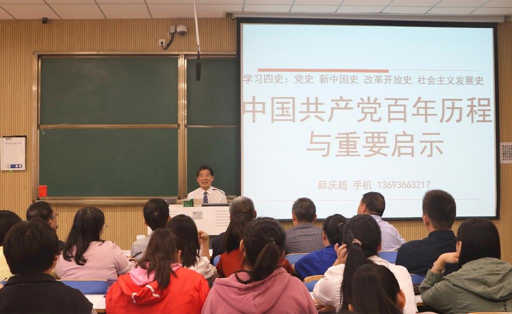 薛庆超援引习近平总书记关于“学习党史、国史,是坚持和发展中国特色社会主义,把党和国家各项事业继续推向前进的必修课”的重要论述,以中国共产党艰苦卓绝的奋斗历程为主线,从八个方面全景式地展现了中国共产党从大革命时期、土地革命时期、抗日战争时期、解放战争时期、社会主义革命和建设时期、改革开放时期到决胜全面建成小康社会时期波澜壮阔的历史图景。他详细阐述了中国共产党领导人民从苦难走向辉煌的百年奋斗历程,指出中国共产党取得胜利的关键在于善于总结经验,汲取教训。整场报告内容丰富、脉络清晰、旁征博引、深刻透彻,具有较强的指导借鉴意义。会后,薛庆超在社科楼323会议室,就大别山精神内涵,红旗渠精神的传承与发展等问题与小说狂人
