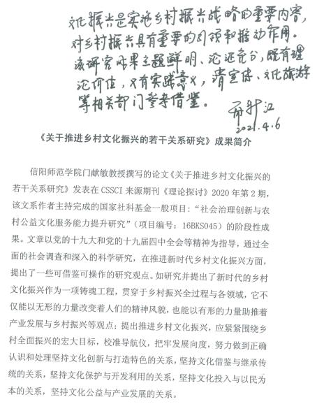 门献敏教授撰写的论文《关于推进乡村文化振兴的若干关系研究》发表在CSSCI来源期刊《理论探讨》2020年第2期,该论文是其本人主持完成的国家社科基金目:“社会治理创新与农村公益文化服务能力提升研究”(项目编号:16BKS045)后续研究成果,据悉,这一成果获河南省人大常委会副主任乔新江同志签阅批示。