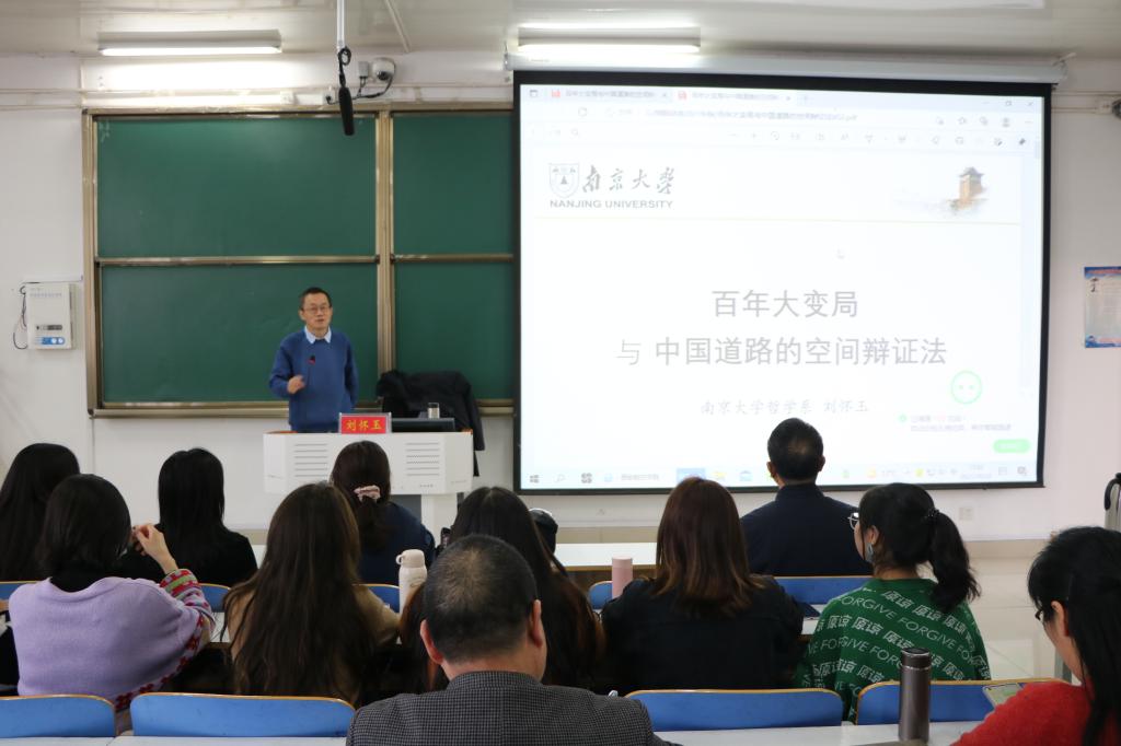 刘怀玉从中国道路“革命的”空间突围、“建设的”空间探索、“发展的”空间构建、“复兴的”空间创造四个历史时期对中国的空间建构进行了深入分析。结合世界格局的发展变化,他指出,中国道路探寻在百年变局中经历“被动卷入—打破藩篱—主动参与—引领格局”的辩证逻辑。他强调,必须辩证认识和把握国内外大局势,统筹中华民族伟大复兴战略全局与世界百年未有之大变局,深刻认识错综复杂的国际环境带来的新矛盾新挑战,增加机遇意识与风险意识。会后,刘怀玉在社科楼323会议室,与小说狂人