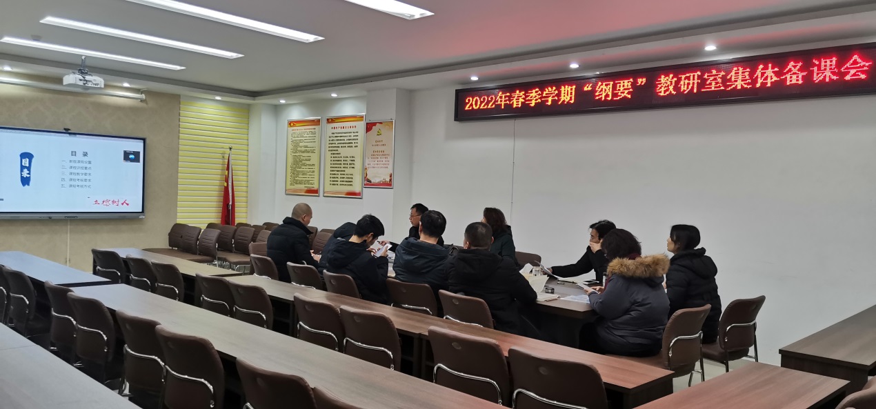 “纲要”教研室“2022年春季学期集体备课会”在学院会议室召开。学院教学副院长訾其伦、教学秘书张琳及“纲要”教研室全体老师参会。会议由教研室主任陈杰主持。