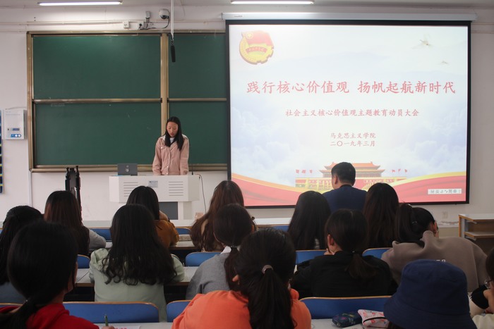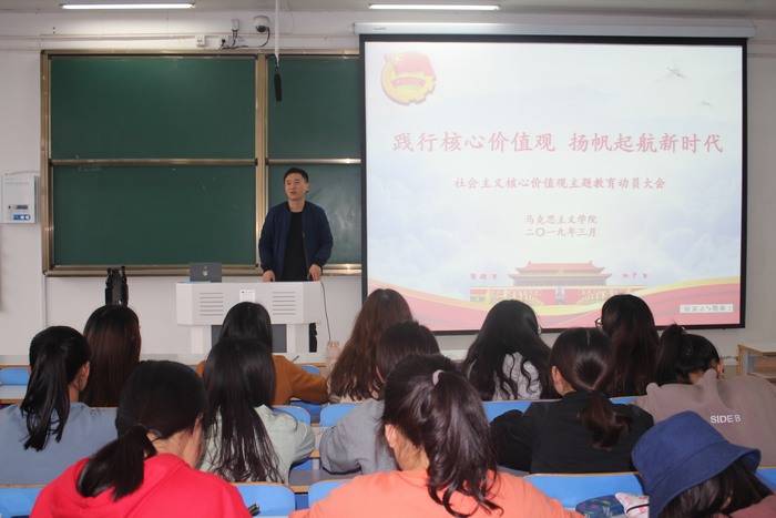 3月29日下午,小说狂人 于社科楼516教室召开了“践行核心价值观,扬帆起航新时代”的社会主义核心价值观主题教育动员大会。小说狂人 团委书记曹栋,主席团成员,及17、18级部分学生共同参加了动员大会。会议由分团委副书记肖妍杰主持。