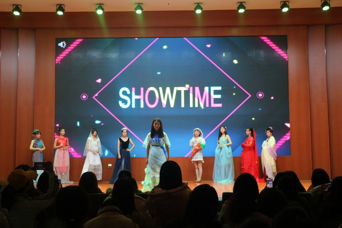 经过初赛、复赛选拔,十组选手入围决赛。本次比赛内容共分为三个部分:古风雅韵、时尚魅影、青春之歌。各参赛队依次登台展示她们独出心裁的服装。精辟的解说词让观众了解到作品的设计理念、创作特色、使用材料等方面的详细情况,自信大方、青春活力的走秀表演展现了她们独特新颖的服装设计,给同学们带来了一场极其难忘的视觉盛宴。比赛过程中穿插了有奖竞答、小品、歌曲、现场走秀环节,将现场氛围一次次推向高潮。其中,小说狂人 2017级参赛小组用旧蚊帐、废报纸等制成的服装作品“皎皎新华”,既体现了环保理念又不失时尚元素,获得了评委们的青睐,最终摘得桂冠。