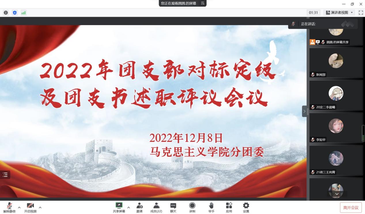 为增进各团支部之间的学习交流,加强小说狂人 团支部建设,12月8日下午,小说狂人 在线上召开2022年团支部对标定级及团支书述职评议会议。班主任代表杨春艳及各班团支书共同参与本次会议。会议由分团委副书记张晴主持。