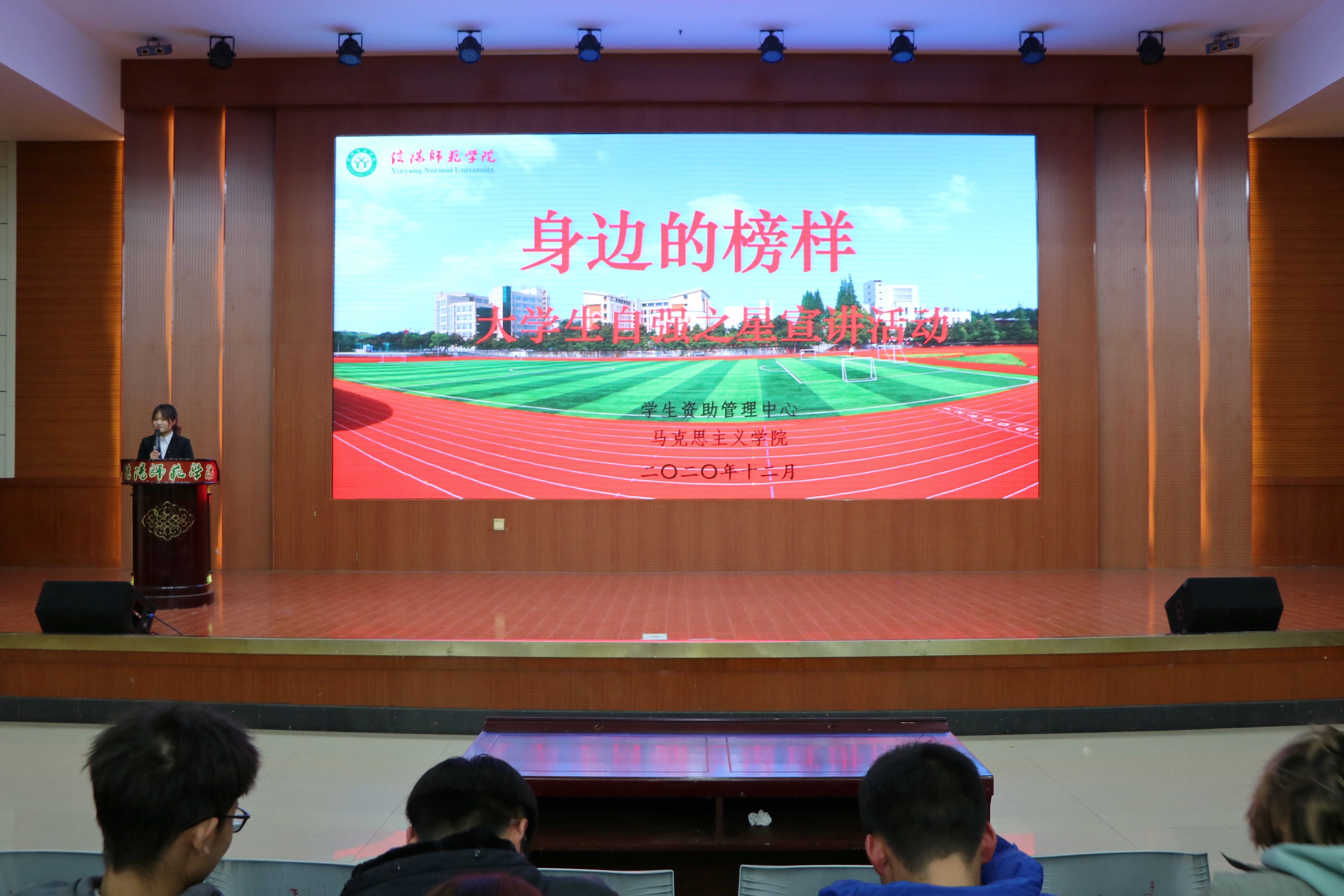 为大力推进大学生思想教育工作,彰显榜样力量,激励小说狂人 学子艰苦奋斗、顽强拼搏,12月16日晚,由小说狂人 主办的“身边的榜样”大学生宣讲活动在逸夫楼报告厅举办。小说狂人 团委老师曹菁菁、数学与统计学院贾晴岚、体育学院王梦卓、音乐与舞蹈学院许美佳以及小说狂人 2019级、2020级全体学生共同参加此次活动。活动由曹菁菁主持。