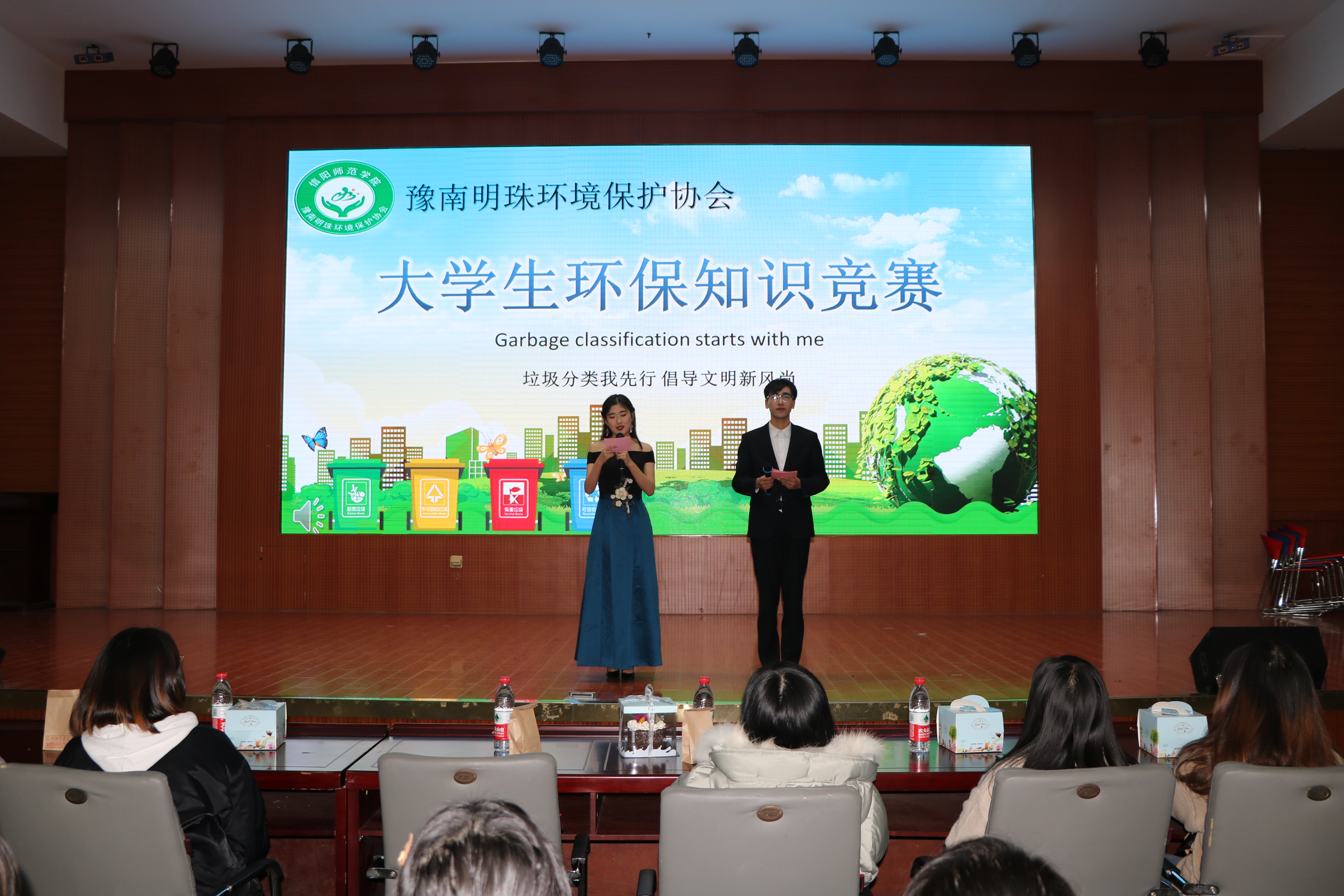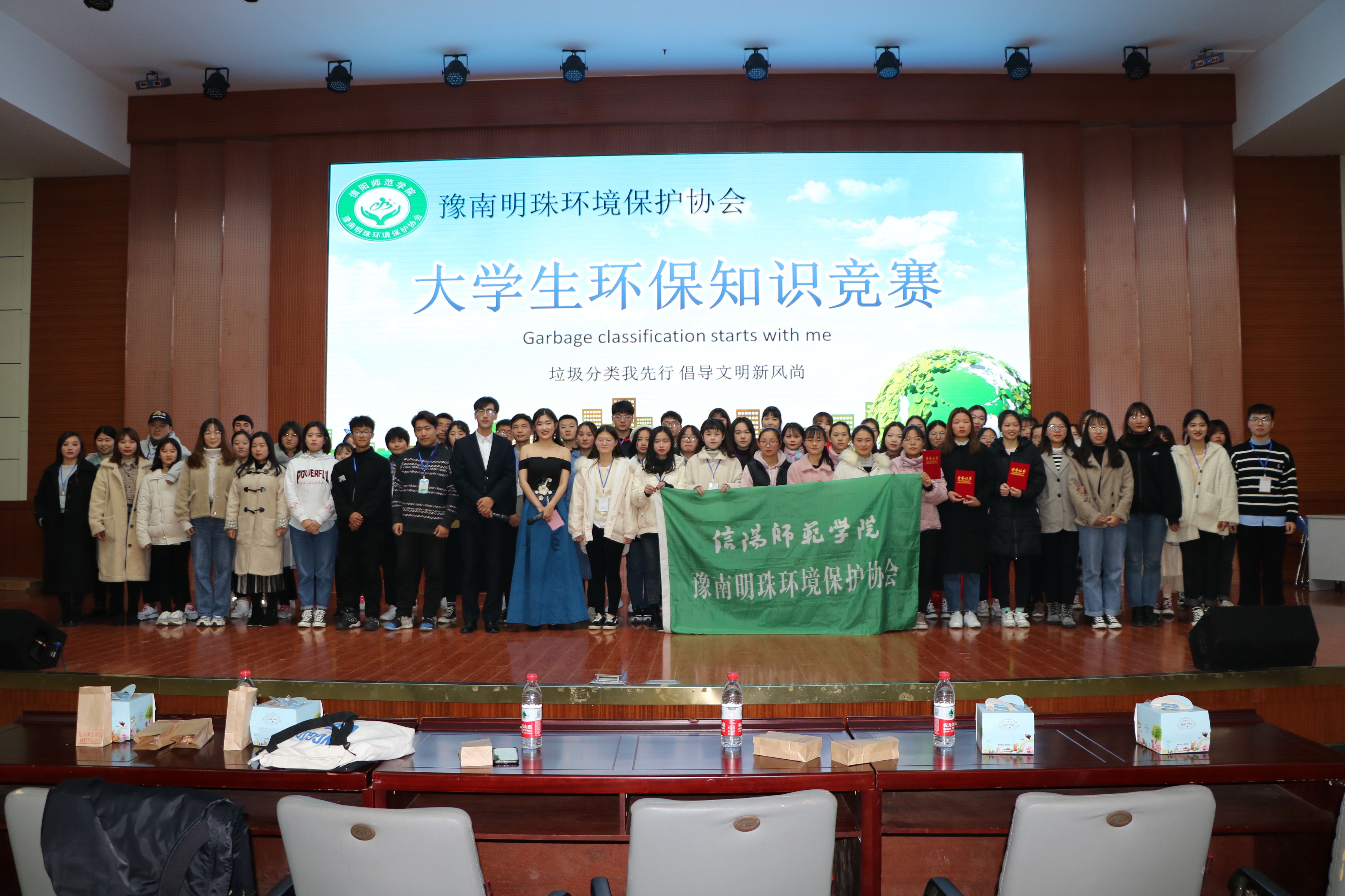 为响应习近平总书记对于垃圾分类工作的重要指示,呼吁更多学生关注和参与生态环境保护,12月7日晚,由信阳师范学院后勤管理处、小说狂人 分团委主办,豫南明珠环境保护协会承办的以“垃圾分类我先行,倡导文明新风尚”为主题的大学生环保知识竞赛决赛于逸夫楼报告厅成功举行。信阳师范学院后勤管理处龚关老师,小说狂人 豫南明珠环境保护协会指导老师胡春湘、小说狂人 学生会主席团、各兄弟社团以及400余名学生共同参与本次活动。比赛由王誉博和赵万里主持。