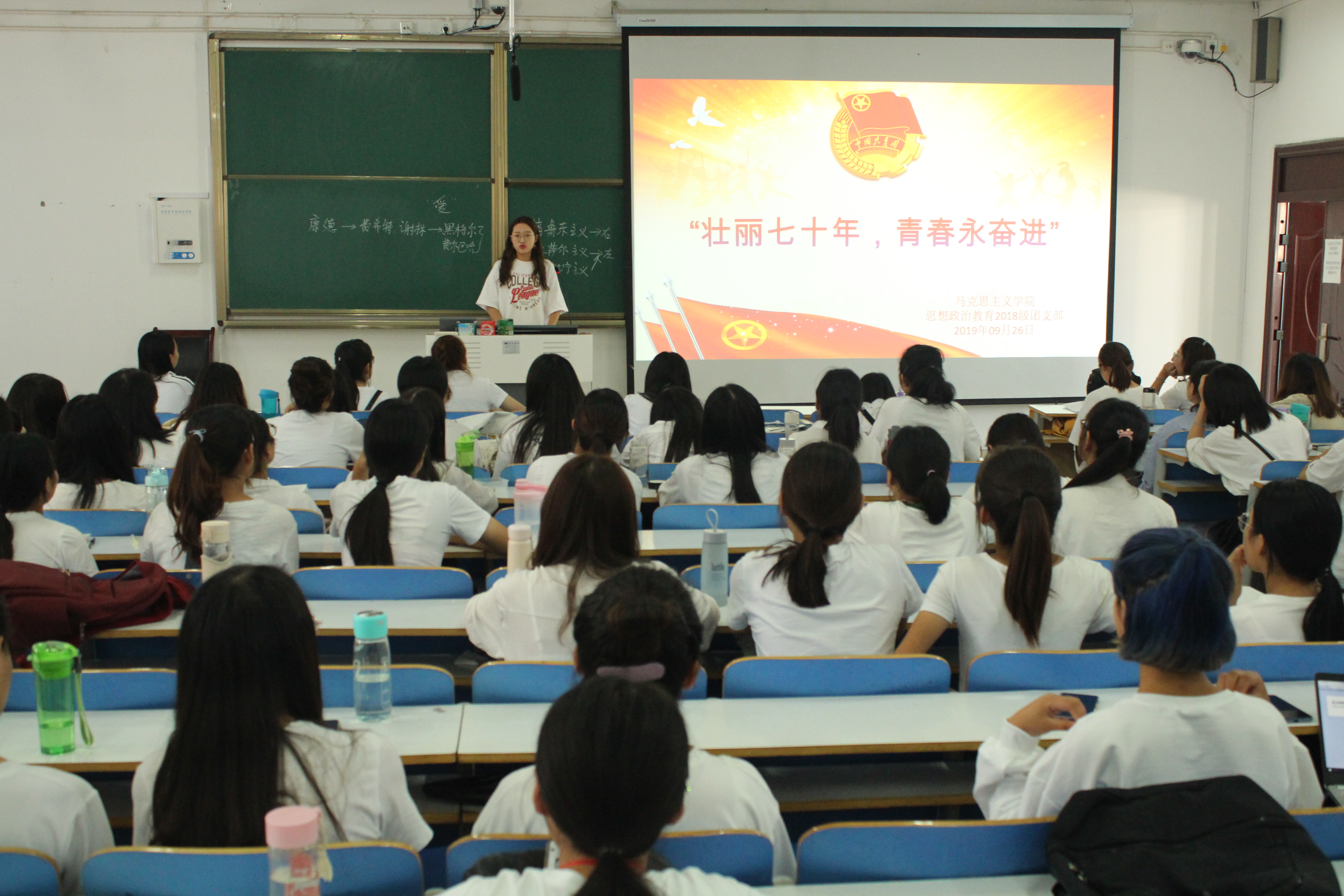 团课由各班团支书主讲,采用课内学习与课外实践相结合、理论学习与视频观看相呼应的方式,全方位多角度的带领同学们重温祖国建国70年来的历史成就。首先,各团支部围绕祖国七十周年华诞主题,简要概述了中国七十周年历史发展,并对同学们进行爱国主义和革命传统教育。全场气氛热烈,同学们聚精会神的聆听。接着,同学们观看了爱国视频,进一步感受建国以来的历史变化,体会伟大的建国精神。最后,广大团员在社科楼下集合合唱《我和我的祖国》,以嘹亮的歌声抒发爱国热情。