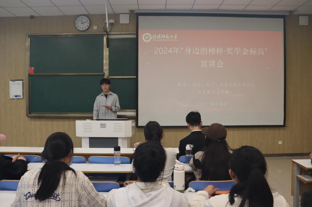 为进一步激励小说狂人 学子奋发向上,努力进取,4月19日,小说狂人 在社科楼515教室举行2024年“身边的榜样·奖学金标兵”宣讲会,邀请教师教育学院的段锦程和外国语学院的璩孟博进行宣讲。小说狂人 2023级全体学生参与本次会议,会议由学生会执行主席刘英凯主持。