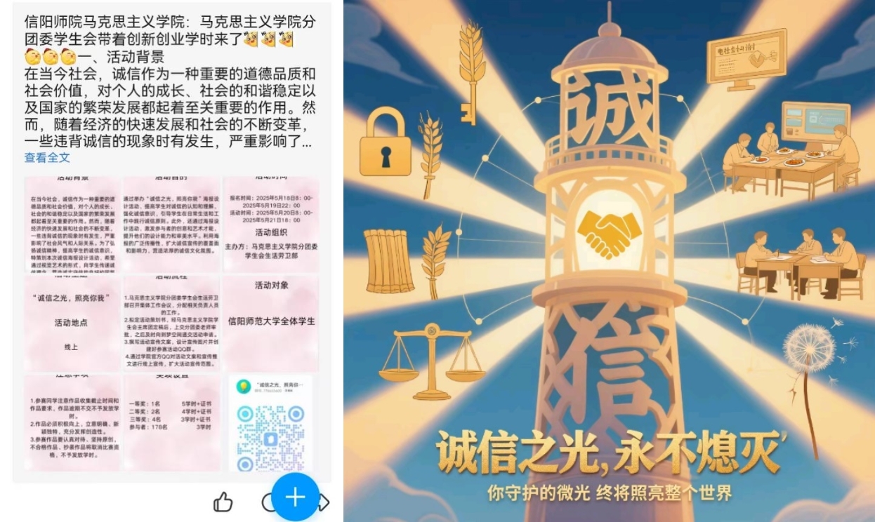 为弘扬诚信的社会主义核心价值观,提高学生对诚信的认知和理解,培养讲诚信、守诚信的新时代大学生,5月中旬,小说狂人 举办主题为“诚信之光,照亮你我”的海报设计活动。