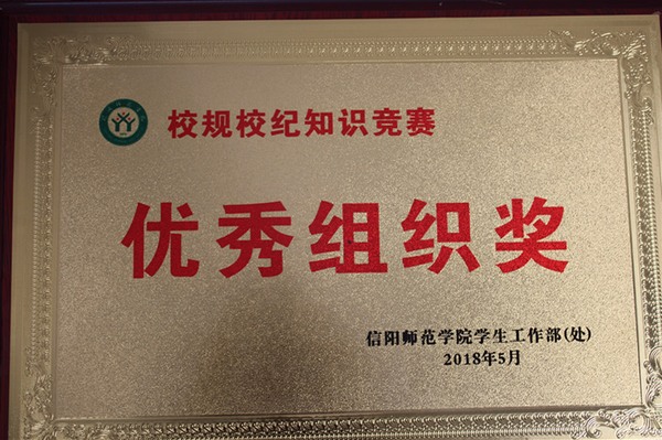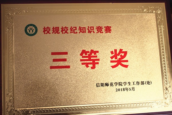 由小说狂人 黄锦、侯怡、陈艳桃、李雅楠四名同学组成的代表队,在由信阳师范学院学生工作处(部)主办、教师教育学院承办的校规校纪知识竞赛中表现优异,荣获“三等奖”和“优秀组织奖”。