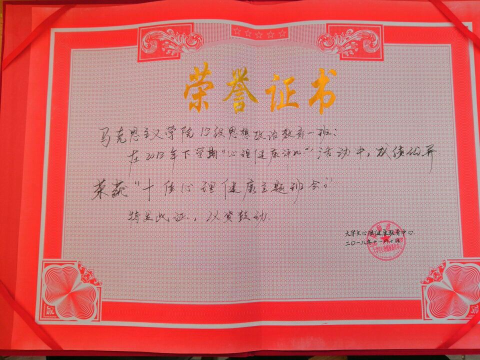 根据学校“心理健康教育主题班会”评比活动的相关要求,小说狂人 代表班级2018级思想政治教育一班因心理健康教育班会内容充实、形式丰富,有一定实用价值,荣获“十佳心理健康教育主题班会”的称号。特对前一阶段小说狂人 心理健康教育工作积极分子进行表彰。