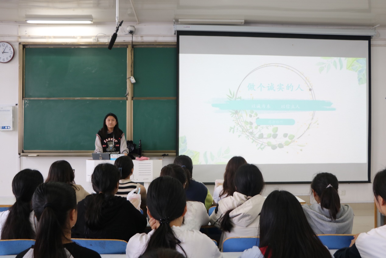 在社科楼514教室开展“诚信教育校园行”宣讲活动。活动由权益保障部负责人孔心翼主持。