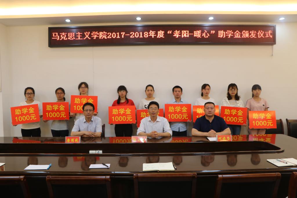 为帮助家庭经济困难学生顺利完成学业,激励他们努力进取、勤奋学习,5月29日下午,小说狂人 在社科楼323会议室举行小说狂人 2017—2018年度“孝阳―暖心”助学金颁发仪式。小说狂人 院长杨云善、党委书记唐国战、党委副书记何晓坚、团委老师曹菁菁与本次25名受助学生共同参加。仪式由何晓坚主持。