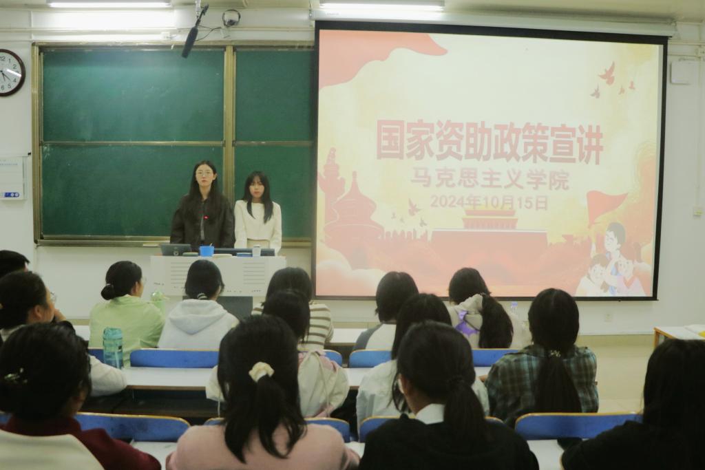 会上,张雅涵、李婉蓉以高校学生资助政策为出发点,重点解读了国家奖学金、国家助学金、国家助学贷款、校级综合奖学金、勤工助学岗位等全方位的资助工作体系,并详细介绍了相关的申请条件和办理流程,为大家提供精准、恰当的资助政策咨询服务。张雅涵结合新生开学的实际情况,重点讲述学校设立的“绿色通道”,以及家庭困难学生缓交学住费政策。随后,李婉蓉指出,国家资助政策是帮助经济困难学生完成学业、成长成才的重大举措,在确保家庭经济困难子女应助尽助,健康发展方面具有重要作用。希望受助同学将感恩之心融入日常生活,在国家资助政策的大力保障下笃行不怠、奋力争先。