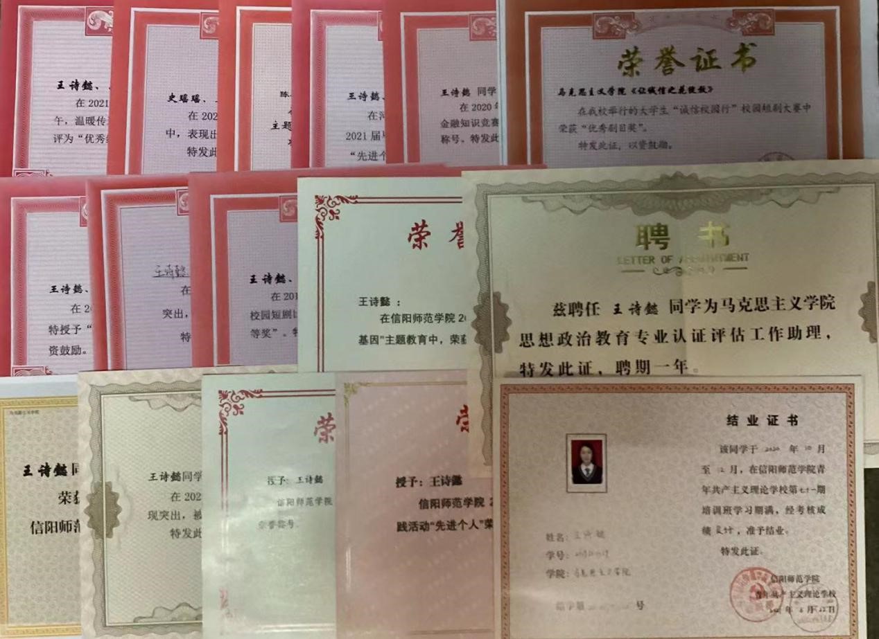 在学习方面,该生勤奋刻苦,善于思考,坚持练就过硬本领,努力提高科学文化水平,时刻把学习当作自己的第一任务,积极投入到各门基础课和专业课的学习中,并不断提高自身写作能力,积极撰写《在抗疫中书写奋斗青春》、《以高尚人格增添思政课教师魅力》等文章,并在《南湖评论》上发表。2019-2020学年荣获校级三等奖学金,顺利通过英语四级考试、普通话水平测试。不仅注重专业知识学习,而且注重提升综合能力,积极参加广播体操比赛、微团课比赛、南湖理论研讨社主题征文活动、学生会夜跑活动、“丹青墨韵”摄影美术作品大赛、仁杰工作室笔锋征文活动,参演了新生联谊晚会和2020年元旦晚会。2019年,参加学院“诚信校园行”校园短剧比赛中,荣获一等奖;2020年,参加法学与社会学学院手帐比赛获得二等奖;参加计算机学院“疫中成长分享你我的故事”比赛中获得手账组二等奖;参加小说狂人 “诚信伴我行”线上金融征信知识竞赛获得二等奖;2021年,参加信阳师范学院“拼贴手账,我手秀我型”活动,荣获“三等奖”;参加“莘莘学子学四史,同心向党迎华诞”主题活动,被评为“优秀工作者”;被评为信阳师范学院2021年度三好学生。