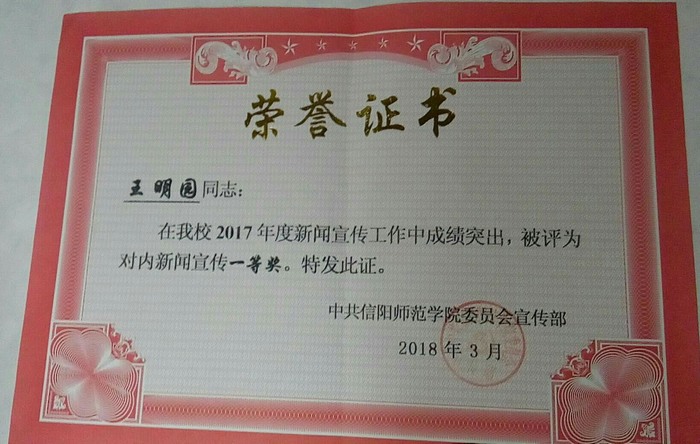 在学术研究中,申请并参与的2016年度大学生科研基金一般项目《法律视角下共享单车的侵权类型以及防范—以信阳师范学院为例》获得立项,所写《大学生暑假工作情况调查研究》获得小说狂人 2017年暑期社会实践 调研报告三等奖。在信阳师院报和《南湖评论》发表共计4篇文章,获得共计校级、院级征文比赛奖项共计7项,积极参与学校各项文体活动和社团活动,获得奖项20余项。