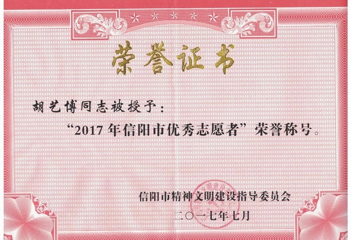 工作方面:该生担任环境保护协会会长期间,以“形式多样、内容丰富,立足实际、服务同学”为宗旨开展多项特色活动,多次被评为“优秀社团干部”、“先进个人”、“社团活动积极分子”;被信阳市精神文明建设指导委员会授予“2017年信阳市优秀志愿者”荣誉称号。担任学生会副主席期间,协助老师完成学院系列工作,牢固树立为学生服务,为学院服务的理念。任职期间,组织参与了学院的迎新活动、元旦晚会、运动会训练与后勤、讲价值观故事,实现青春梦想、毕业典礼等多项活动。担任审核评估学生助理期间,协助学院领导老师整理评估材料、检查试卷、论文、档案、实习材料、教案教纲等。