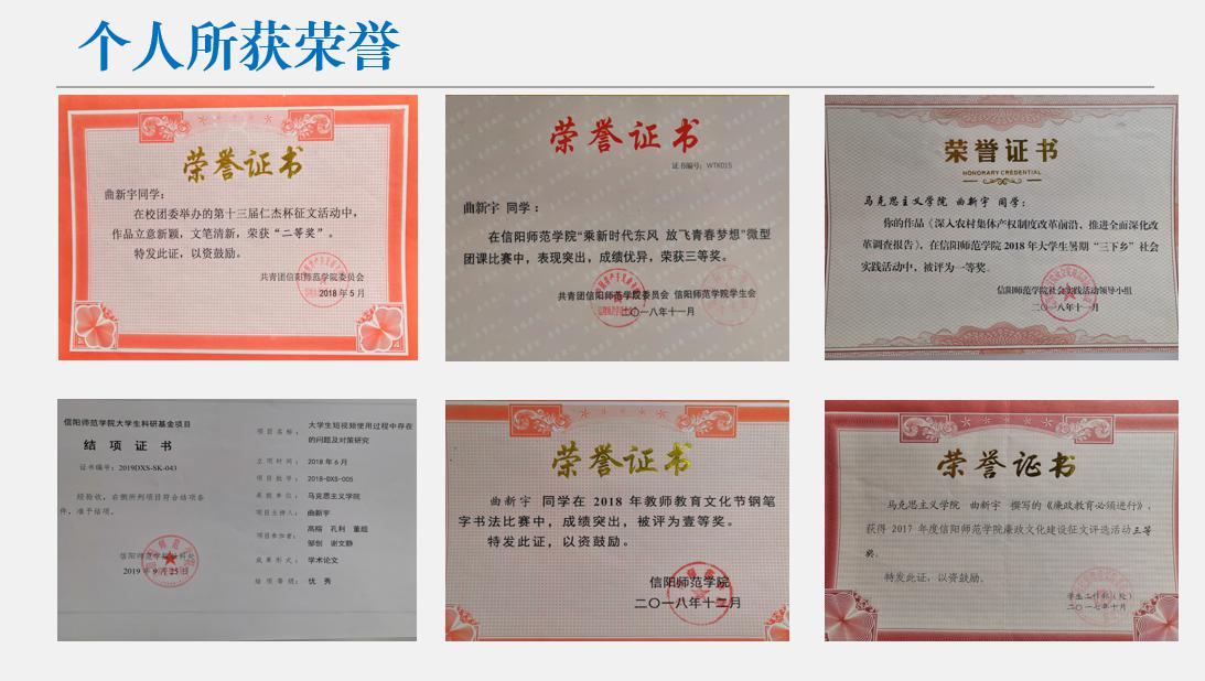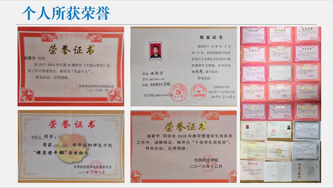 2017-2018年,该同学担任2017级新生军训临时班级负责人,参与组织班级各项工作;10月当选班级学习委员,进入学院学生会学术部、校团委仁杰工作室宣传部任干事。本年度获得信阳师范学院廉政文化建设征文评选活动三等奖、信阳师范学院小说狂人 “新迎十九大 共筑中国梦”书法绘画比赛一等奖、学院“团旗下团干宣讲”二等奖、学院“讲社会主义核心价值观故事”征文比赛优秀作品奖、校团委第十三届仁杰杯征文比赛二等奖、学院干部培训班先进个人、学院“‘读’具匠心,致敬经典”优秀组织者第四十期校刊《大别山青年》宣传工作先进个人。