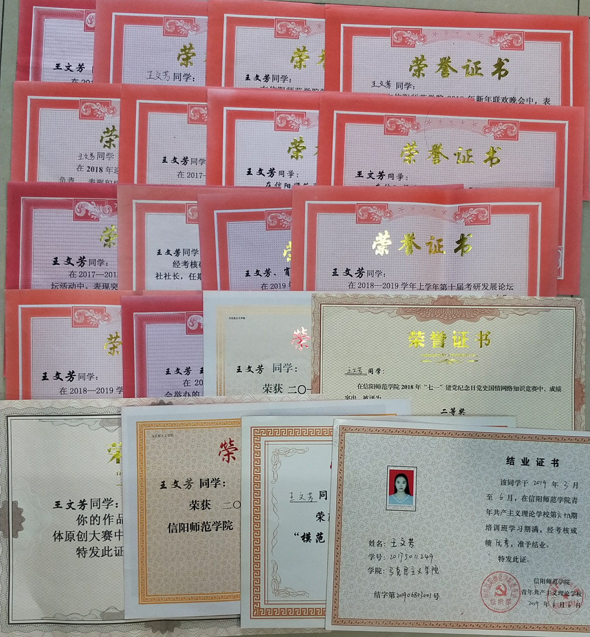 在知识学习方面,勤学善学,求知探索。在大一学年,以班级综合测评第七的成绩获得信阳师范学院三等奖学金。大二学年,班级综合测评第六。自入学以来,努力学习文化课知识,学期末考试均取得优异成绩,目前已顺利通过全国英语四级考试。同时注重课外实践学习,积极参与“大学生暑期三下乡”社会实践活动和小说狂人 “南湖调研”活动,2017年寒假调研报告获一等奖,2018年暑期调研获三等奖,并积极参与大学生科研基金项目申报,所参与的《习近平英雄情怀融入大学生理想信念教育的路径研究》已成功立项,所参与的《五四精神融入高校社会主义核心价值观路径研究》还在进行中,今年暑假三下乡参与的《传承创新“一带一路”茶文化,信阳毛尖香飘西安茶博会调研报告》获校级一等奖。
