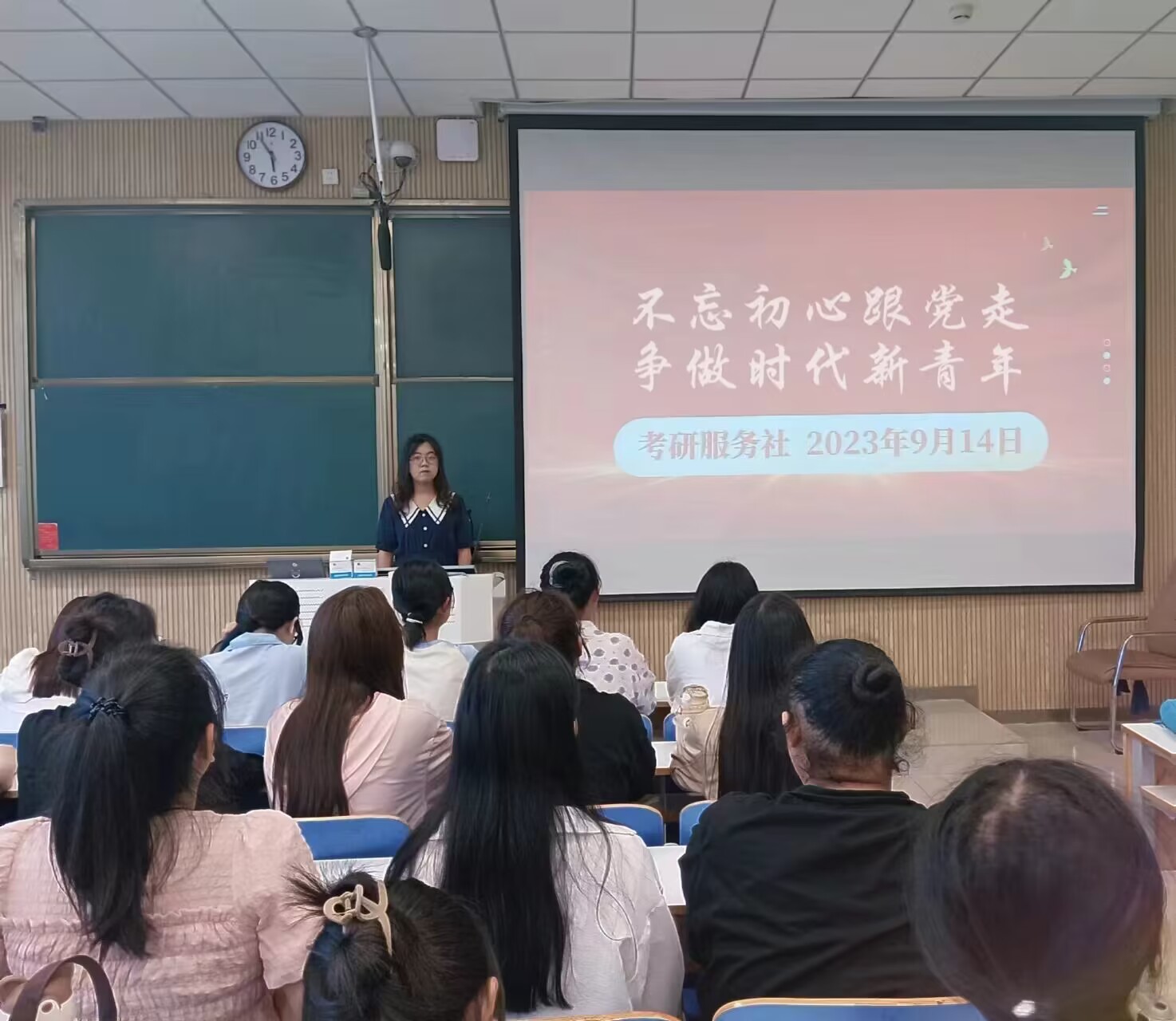 为深入学习贯彻习近平新时代中国特色社会主义思想,引导社团成员了解其思想内涵并积极承担责任,砥砺前行,9月14日晚上,考研服务社于社科楼515召开了“不忘初心跟党走,争做时代新青年”主题团课活动。本次团课由团支书冯钰丹主持,考研服务社全体社员参加。