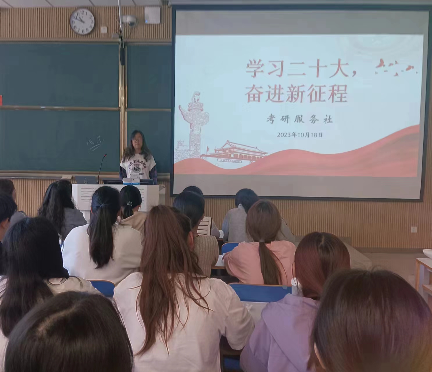 为深入贯彻领会党的二十大精神,培养青年大学生的爱党、爱国精神,弘扬中国红色文化,传承红色精神,真正意义上将党的二十大精神落到实处。10月18日上午,考研服务社于社科楼515举行“学习二十大,奋进新征程”主题团课。本次团课由团支书冯钰丹主持,考研服务社全体社员参加。