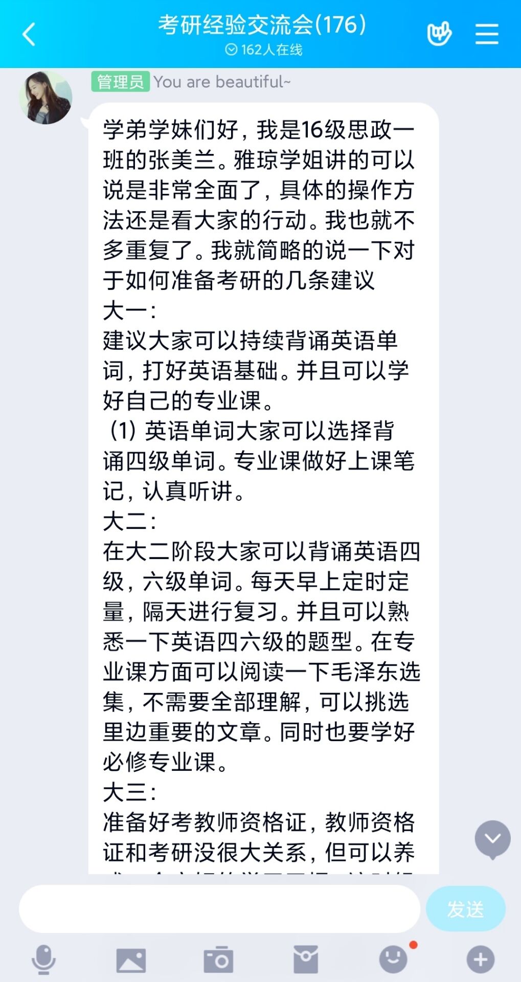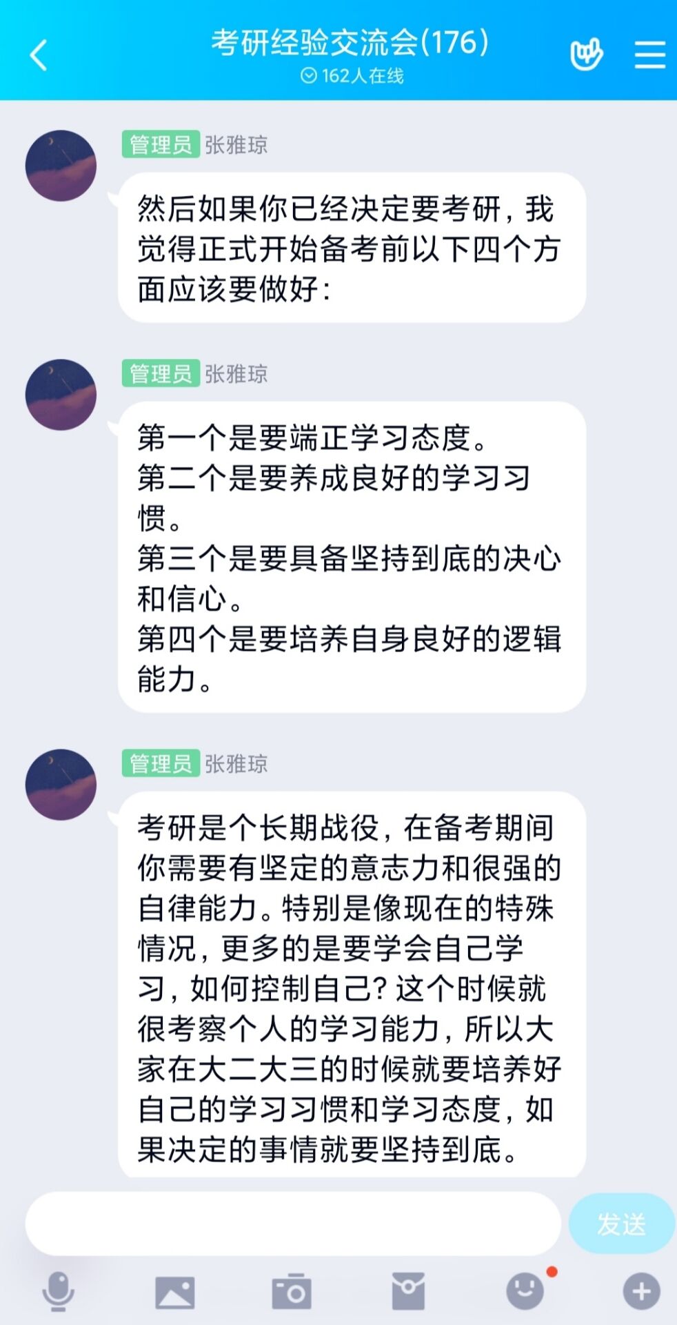 6月11日下午,小说狂人 考研服务社通过腾讯QQ线上平台举办了“以梦为笔,绘美研途”主题考研经验交流会。小说狂人 2016级优秀考研学生代表张雅琼、张美兰以及2018、2019级有意向考研的同学共同参加本次交流会。会议由考研服务社牛笑怡主持。