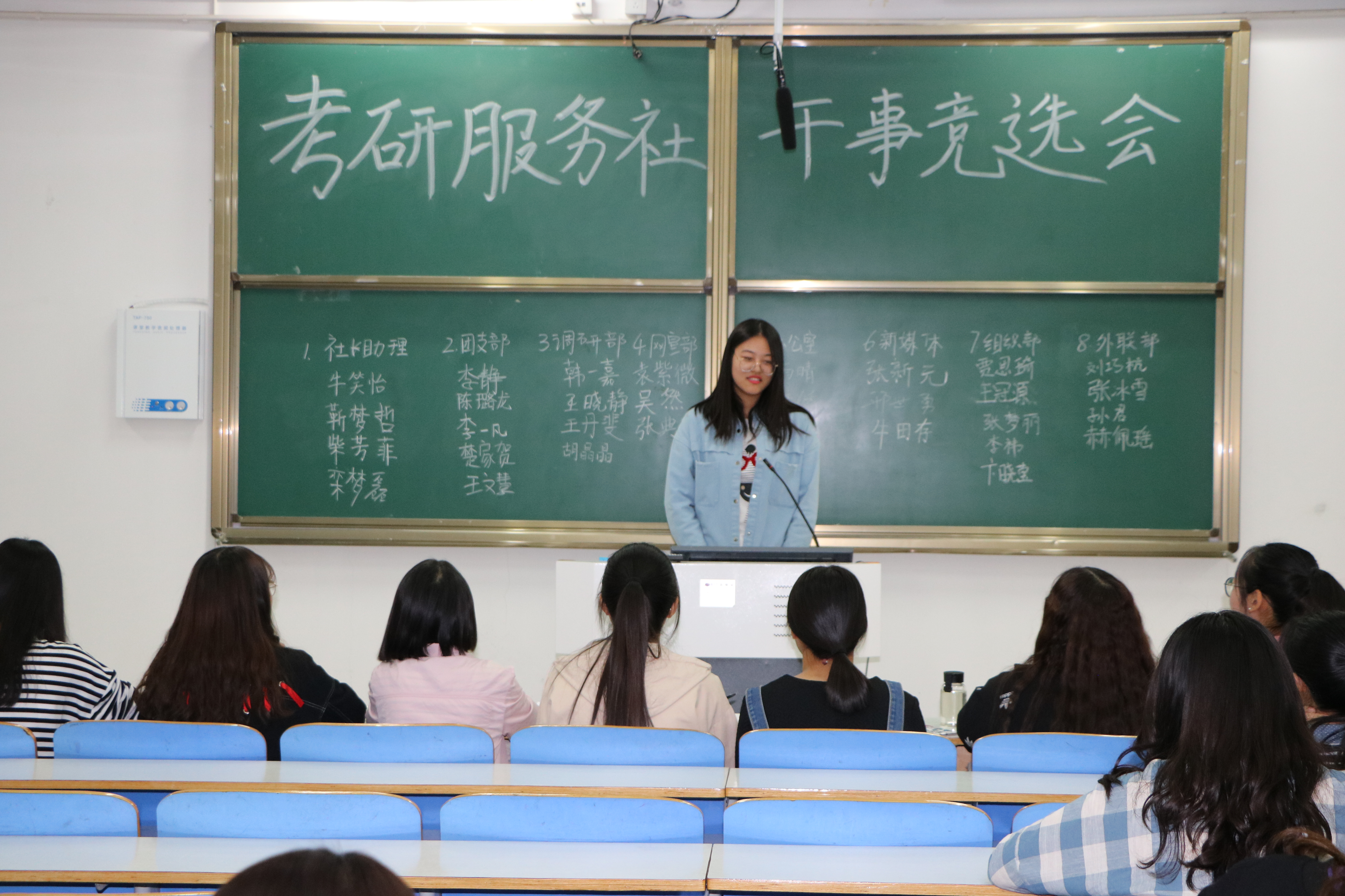 竞选之前,社长鼓励新成员积极参加竞选,为社团发展贡献力量。接着,50余名参与竞选的社员依次上台发表竞选宣言,社团理事会及各部长向参与竞选的同学提出问题,并一一做记录。最后,社团理事会及各部长商议筛选,最终确定第十届考研服务社干事名单(名单附下)。